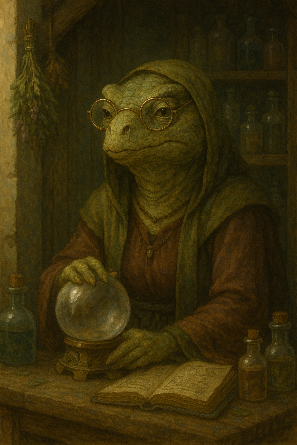 Conoce bien las plantas, hongos, y venenos, pero también tiene intuiciones súbitas que muchos consideran “visión profética”. Gracias a estos conocimientos recolecta hierbas y elabora ungüentos, pociones (algunas milagrosas, otras meramente sabrosas), bálsamos, cataplasmas, y si te interesa cobra por las lecturas de su bola de cristal, que a veces resultan inquietantemente acertadas… y otras se acercan demasiado a desvaríos de una vieja iguana. Es una fuente de conocimiento poco fiable pero fascinante.