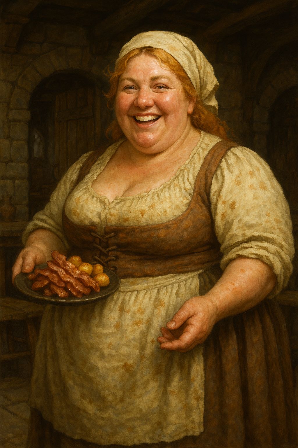 Ocupación: Está contratada como la posadera de la Cerda Disfrutona. Uno de sus platos estrella es freír bacon con una buena cantidad de mantequilla de Broldan, dejándolo crujiente con unas patatas asadas con romero increíbles. Es muy muy parlanchina y cercana, rozando ser una cotilla, pero a parte de tener el control absolutamente claro de la cocina y habitaciones, se entera bien de todo lo que ocurre en Fuerte Brillante y siempre sabe algún chisme de la gente que vive ahí. Sin embargo, es de confianza y no comparte secretos delicados, solo cuenta los chismes divertidos o la información general, porque lo que todo el mundo la tiene en alta estima aunque a veces sea un poco pesada o te deje el hombro o la mejilla grasientos cuando te pega una palmada o un besucón amistoso. Es una figura materna para todos en Fuerte Brillante, pero además es madre de dos chicos (sus “hombrecitos”) de 6 y 8 años que son muy traviesos pero también echan una mano en el establo/cocina y son trabajadores (se llaman Tammy y Goldi). Ambos son de padres diferentes a los que ella echó de casa porque eran unos mandones y holgazanes y no quería que sus hijos crecieran con ellos de referente.