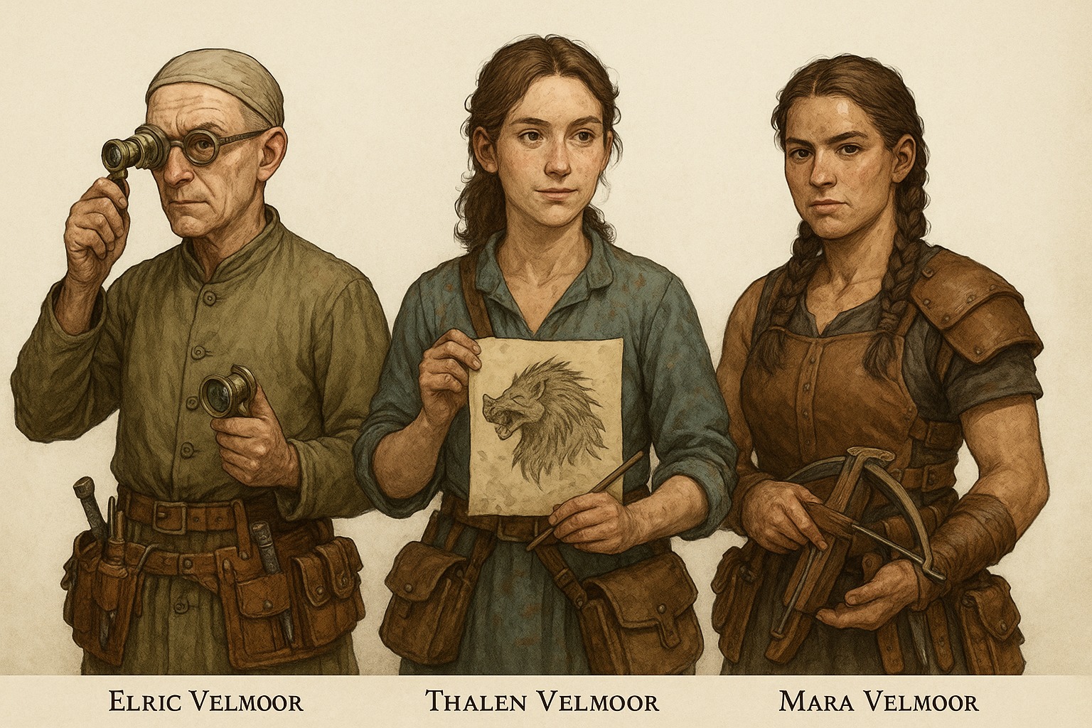 Historia: Nacidos en Puerto Soldado, los tres hermanos Velmoor crecieron entre herramientas, telas enceradas y estuches de madera. Heredaron del taller familiar un respeto absoluto por el trabajo bien hecho, y esa reputación los precedía cuando Lord Highspire los entrevistó para Fuerte Brillante. No buscaba simples ayudantes: quería a quienes fueran capaces de mantener su equipo en condiciones impecables, desde el pulido de una lente hasta el refuerzo discreto de una correa de cuero.